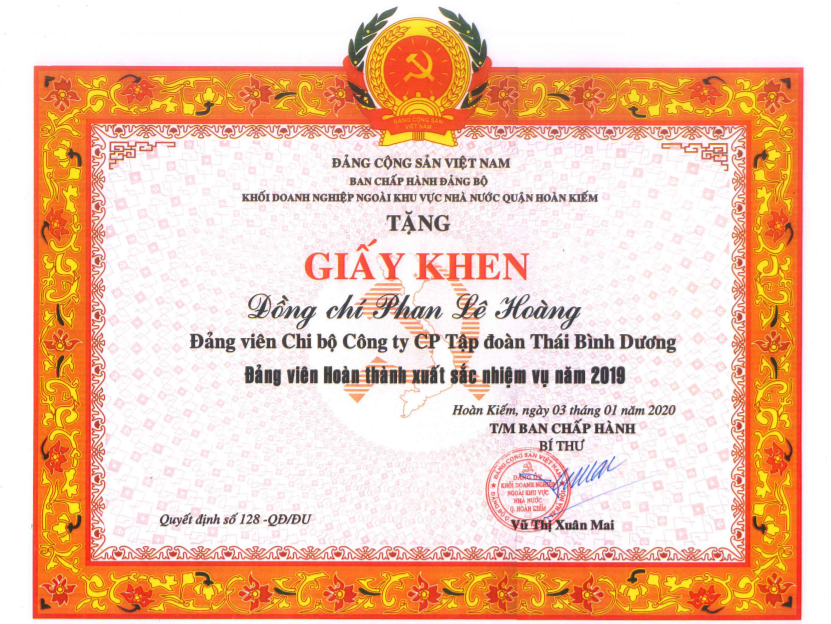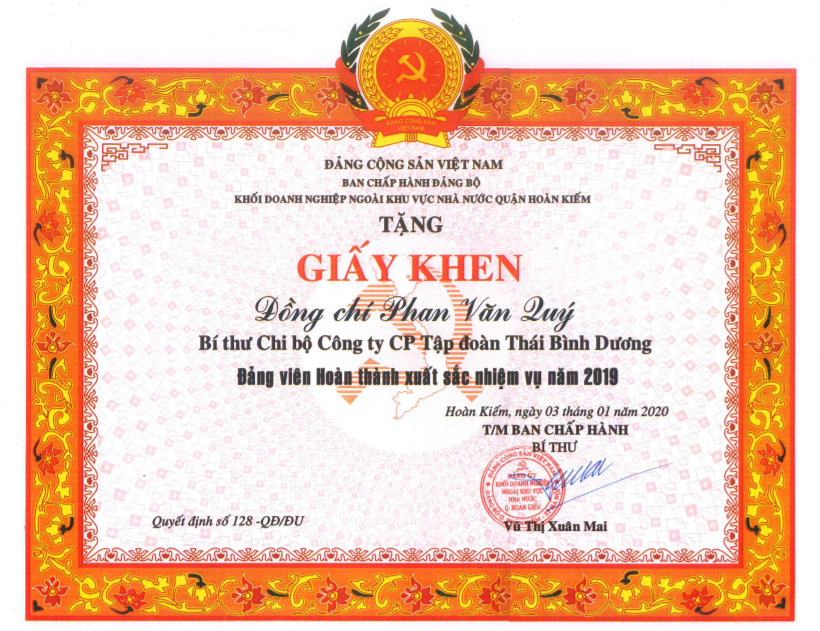 Chiều ngày 9/1/2020, tại Hội nghị tổng kết xây dựng Đảng năm 2019, Đảng Bộ Khối doanh nghiệp ngoài khu vực nhà nước quận Hoàn Kiếm đã tổ chức khen thưởng cho các tập thể đạt tiêu chuẩn Tổ chức Đảng trong sạch vững mạnh tiêu biểu năm 2019, trong đó có Chi bộ Công ty cổ phần Tập đoàn Thái Bình Dương.