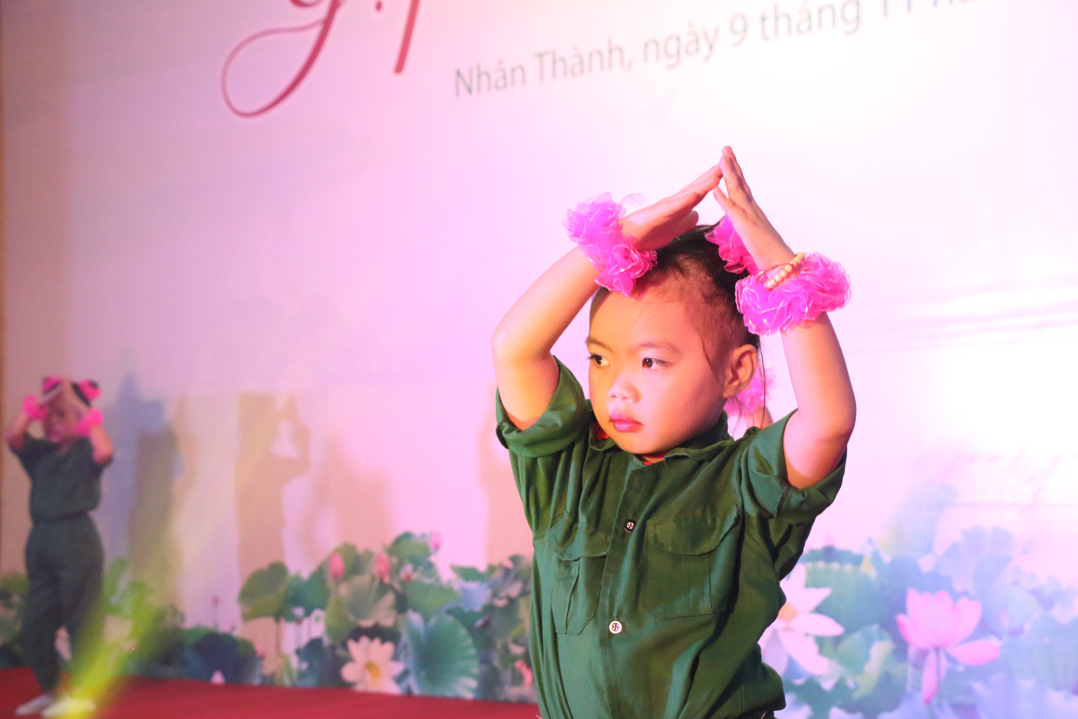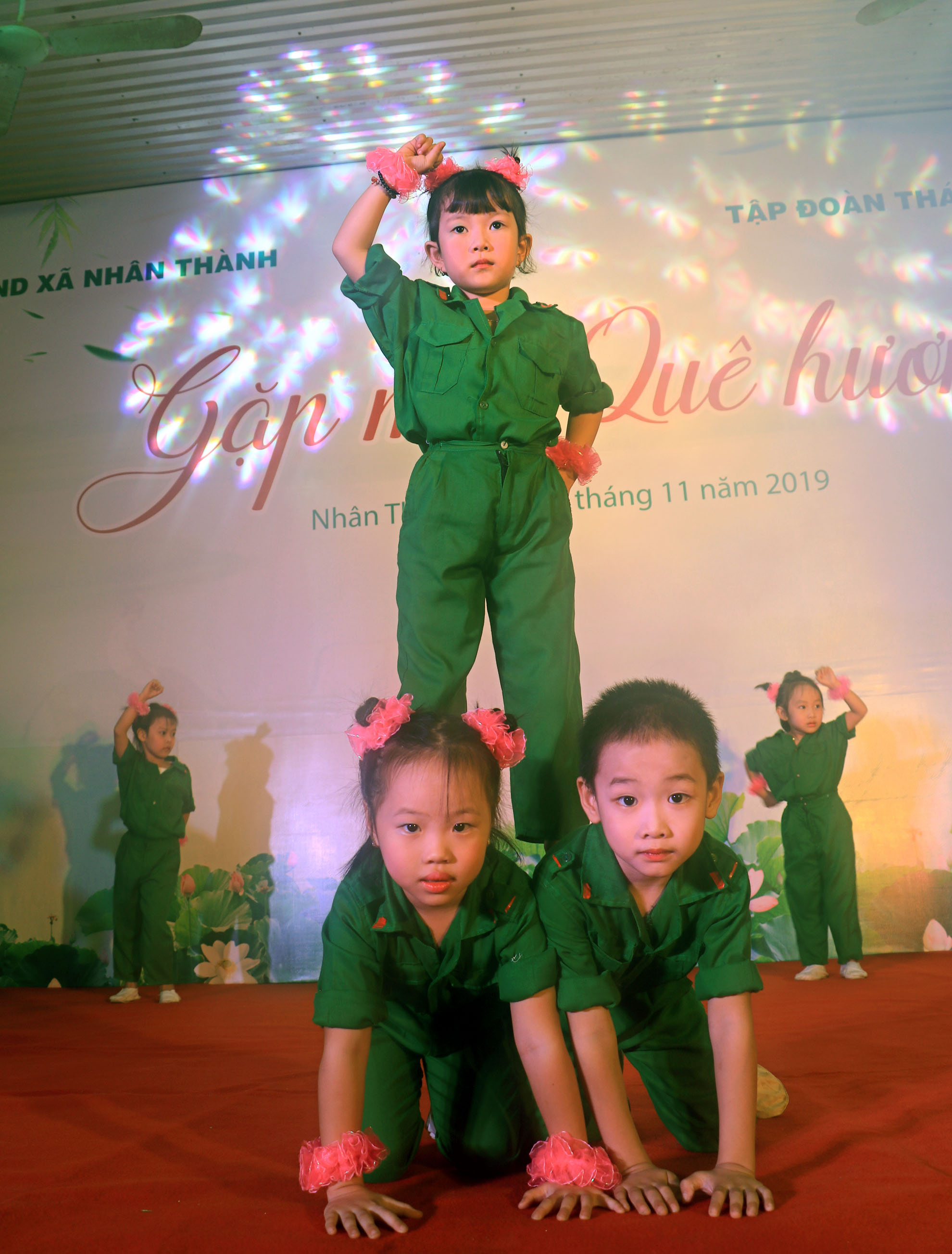 Các chiến sĩ nhí đáng yêu trong tiết mục múa Ước mơ chiến sĩ do các bé trường Mầm non xã Nhân Thành biểu diễn