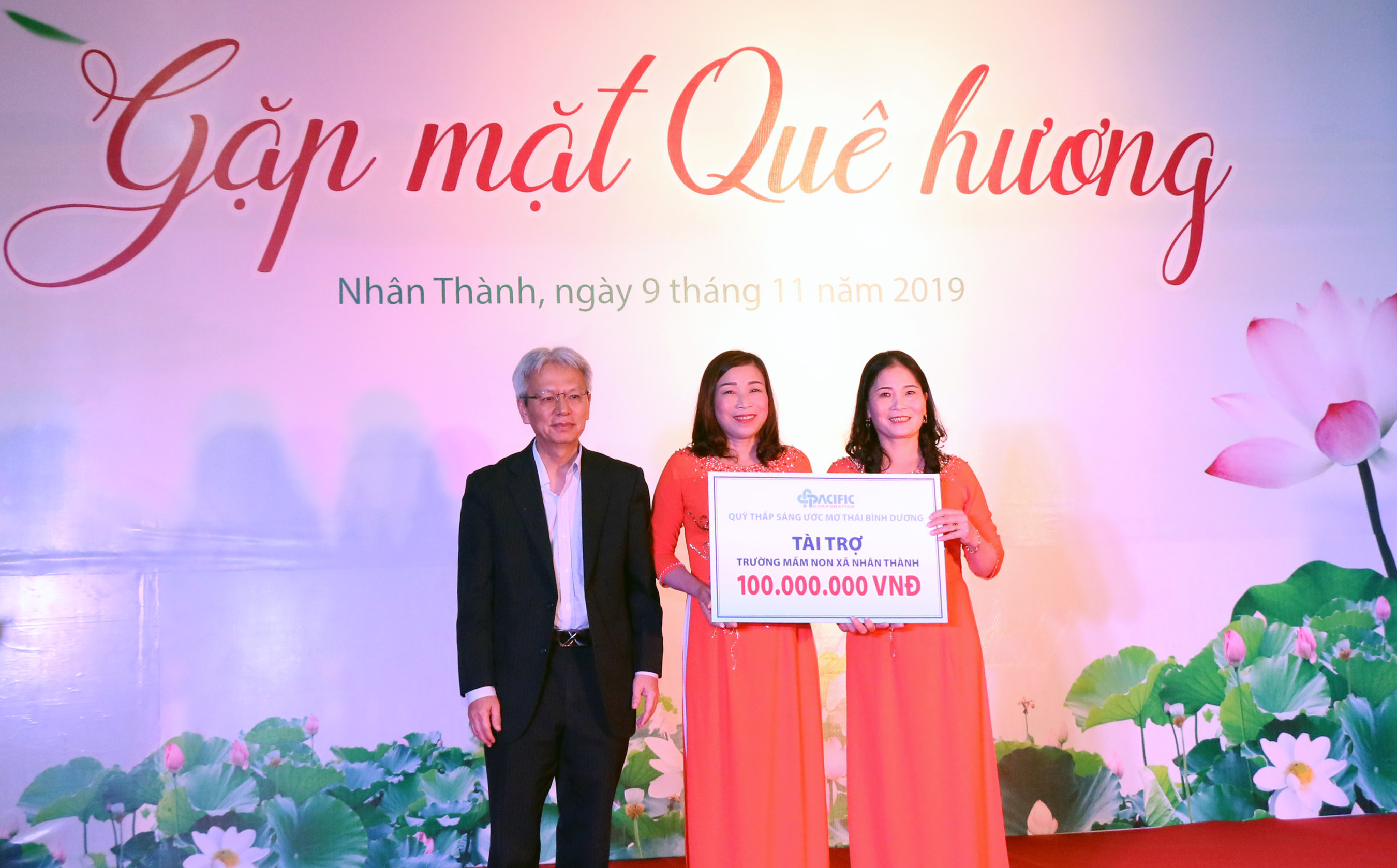 Quỹ Thắp sáng ước mơ Thái Bình Dương thuộc Tập đoàn Thái Bình Dương tài trợ 100 triệu đồng cho Trường Mầm non xã Nhân Thành để góp phần tạo điều kiện học tập, vui chơi tốt hơn cho các em nhỏ.