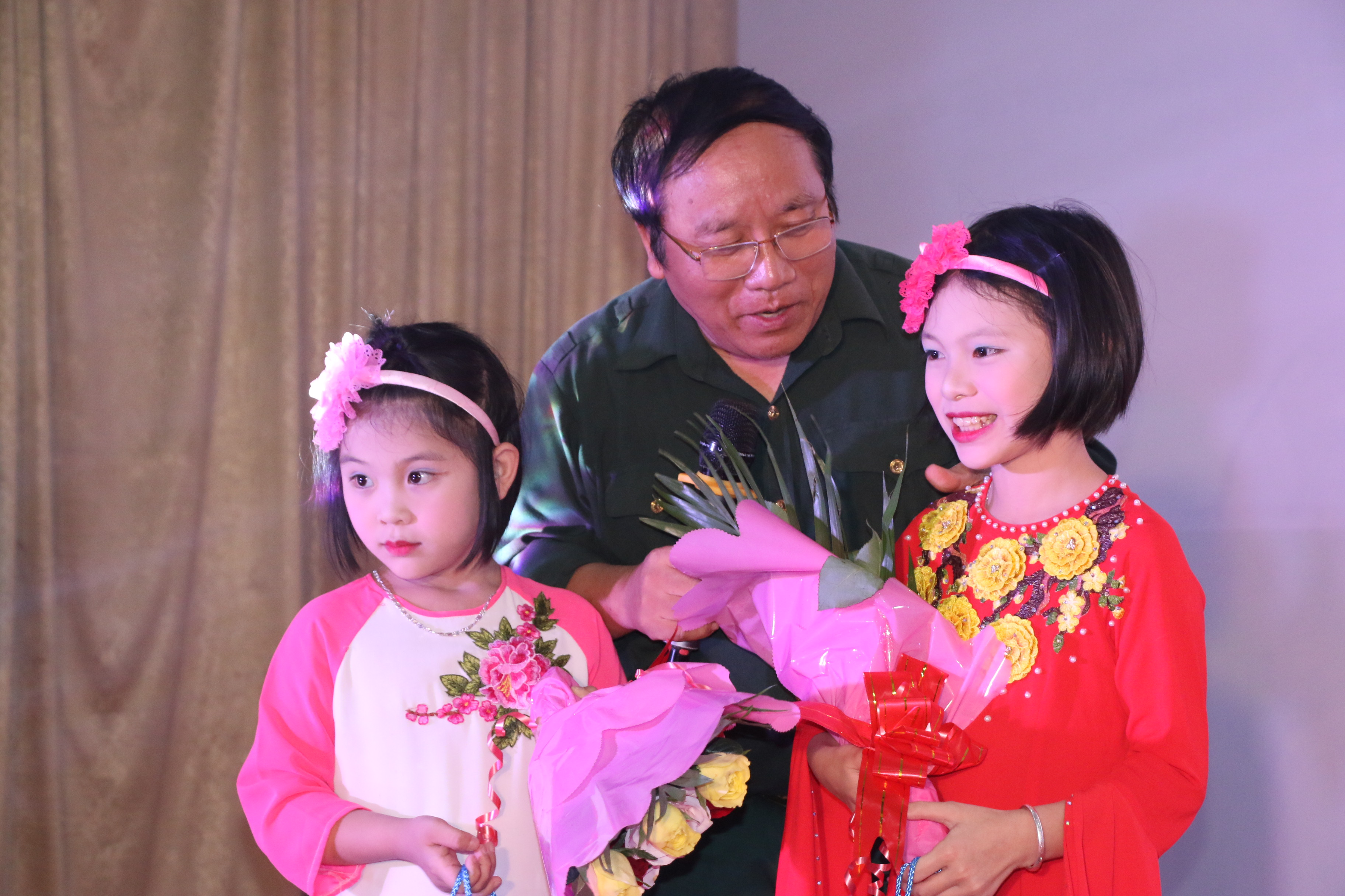 Nhà thơ Trần Đăng Khoa xúc động tặng hoa cho hai bé