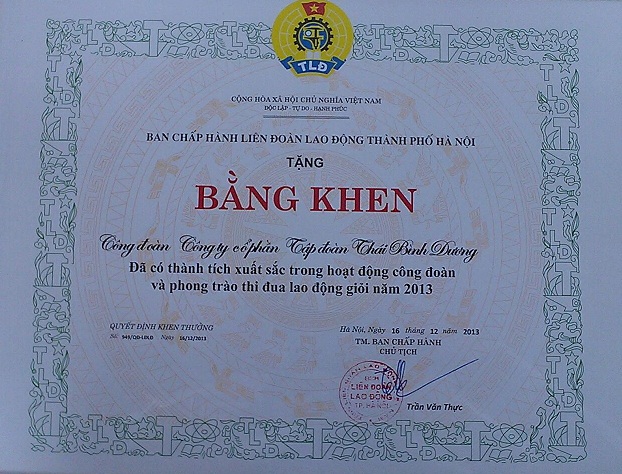 Với những thành tích đã đạt được, Công đoàn Công ty cổ phần Tập đoàn Thái Bình Dương đã được Liên đoàn Lao động Thành phố Hà Nội trao Bằng khen cho đơn vị có thành tích xuất sắc trong hoạt động công đoàn và phong trào thi đua lao động giỏi năm 2013.