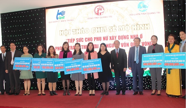 Ông Phan Văn Quý, Chủ tịch HĐQT Tập Đoàn Thái Bình Dương (Đứng thứ 2 từ trái sang) trao tài trợ 1.150.000.000 đồng cho chương trình "Tiếp sức cho phụ nữ xây dựng nhà ở phòng chống thiên tai từ nguồn vốn quay vòng" của Quỹ Hỗ trợ Phòng tránh thiên tai miền Trung tại một số tỉnh miền Trung.
