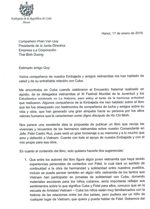 Việc biên soạn cuốn sách đã nhận được sự ủng hộ, đánh giá cao từ phía Đại sứ quán Cuba cũng như bà Lyanis Torres Rivera, đại sứ Cuba tại Việt Nam. Trong thư của Đại sứ Cuba gửi Tập đoàn Thái Bình Dương, bà thể hiện rõ sự ủng hộ về việc này “Tôi thấy ý tưởng xuất bản cuốn sách về những kỷ niệm và trải nghiệm của những người anh em Việt Nam đối với Tổng Tư lệnh Fidel Castro Ruz của chúng tôi rất tuyệt vời, bởi đây sẽ là sự tôn vinh đối với ông, người đã rất yêu quý và bảo vệ Việt Nam. Hãy tin tưởng sự ủng hộ hết mình của Đại sứ quán cũng như cá nhân tôi trong việc này”.