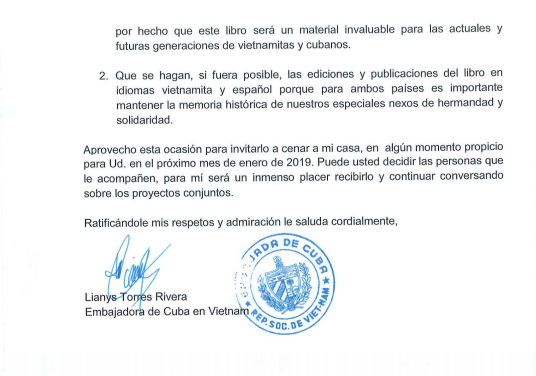 Toàn văn Thư của Đại sứ Cuba, bà Lyanis Torres Rivera