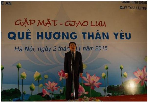 Tham dự buổi gặp mặt ông Nguyễn Xuân Thắng, Ủy viên Trung ương Đảng, Viện trưởng Viện Khoa học xã hội Việt Nam, ông Nguyễn Hòa Bình, Ủy viên Trung ương Đảng, Viện trưởng VKSNDTC, ông Hồ Đắc Vinh, Ủy viên Dự khuyết Trung ương Đảng, Bí thư thứ nhất Trung ương Đoàn, ông Vương Đình Huệ, Trưởng Ban Kinh tế Trung ương… Các đồng nguyên là lãnh đạo trung cao cấp là người Nghệ An ông Nguyễn Mạnh Cầm, nguyên Phó Thủ tướng Chính phủ, Trung tướng Nguyễn Quốc Thước, Nguyên Bộ trưởng Bộ Thông tin và Truyền thông Lê Doãn Hợp, Nguyên thứ trưởng Bộ Giáo dục và Đào tạo Bành Tiến Long….Về phía tỉnh Nghệ An có ông Hồ Đức Phớc, Bí thư tỉnh, đại diện Sở Kế hoạch và Đầu tư, Trung tâm xúc tiến đầu tư. Tham dự buổi giao lưu còn có Đoàn ĐBQH tỉnh Nghệ An, Quảng Ngãi, các đại biểu QH là người Nghệ An, Quỹ Tâm Tài Nghệ An cùng các doanh nghiệp, doanh nhân là con em Nghệ An, một số tổ chức xúc tiến thương mại và doanh nghiệp nước ngoài…