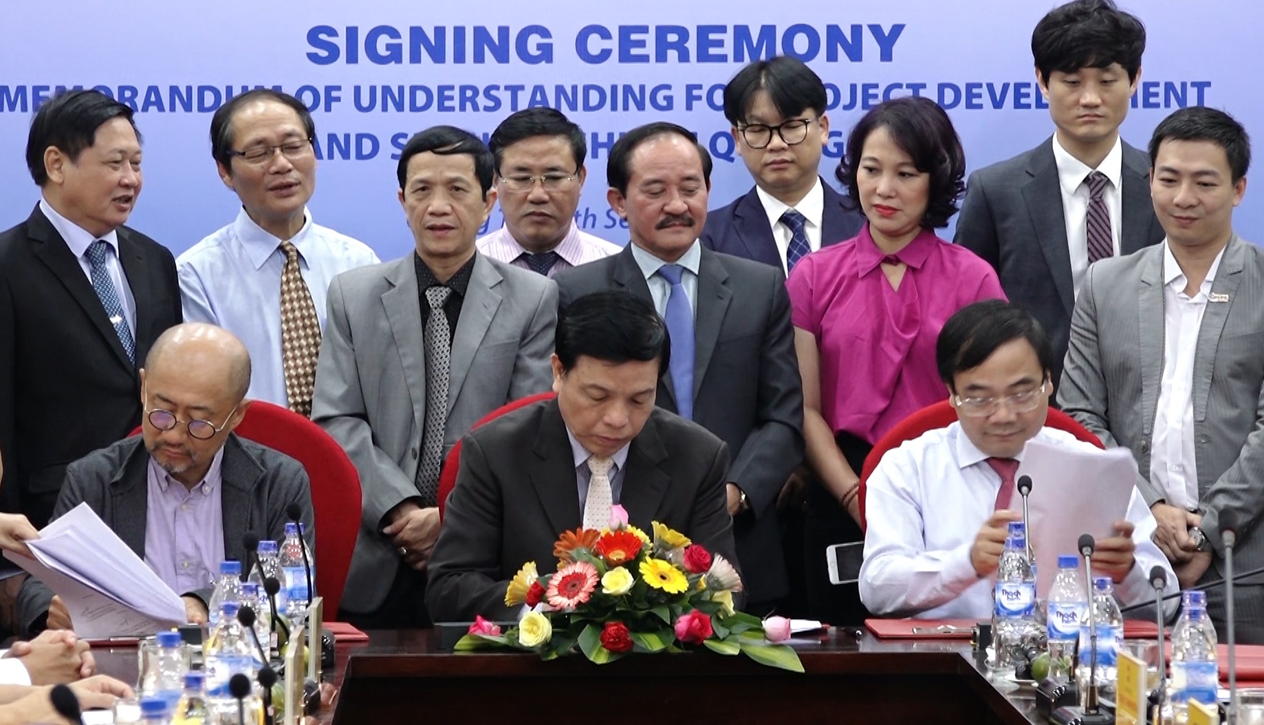 Ông Trần Văn Đoàn, Trưởng ban BQL Khu kinh tế tỉnh Quảng Trị (ngồi giữa), ông Phan Văn Quý, Chủ tịch HĐQT Công ty cổ phần Tập đoàn Thái Bình Dương (ngồi bên trái), ông Kim. Dae Young – Trưởng đại diện tại Văn phòng Hà Nội, Công ty Năng lượng Nam Đông Hàn Quốc, Tập đoàn điện lực Hàn Quốc (ngồi bên phải) ký kết bản ghi nhớ về khảo sát, nghiên cứu đầu tư phát triển dự án công nghiệp.