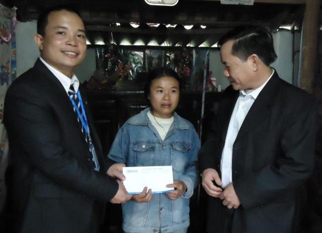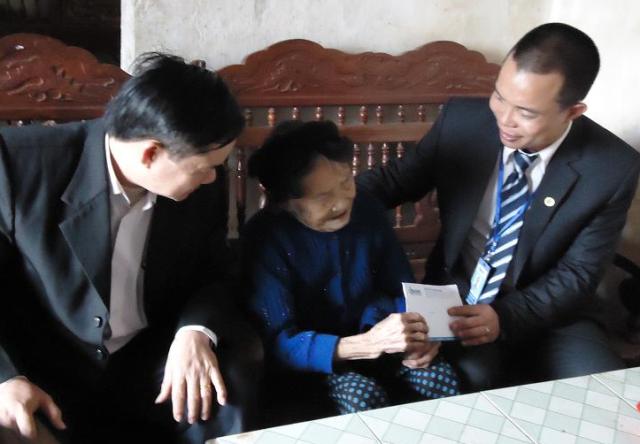 Photo: Representative of Pacific Corporation’s managers and Mr Hoang Minh Ngoi –Chairman of Yen Thanh Fatherland Front Office visited elder Hoang ThiTich of the Ly Thanh village |