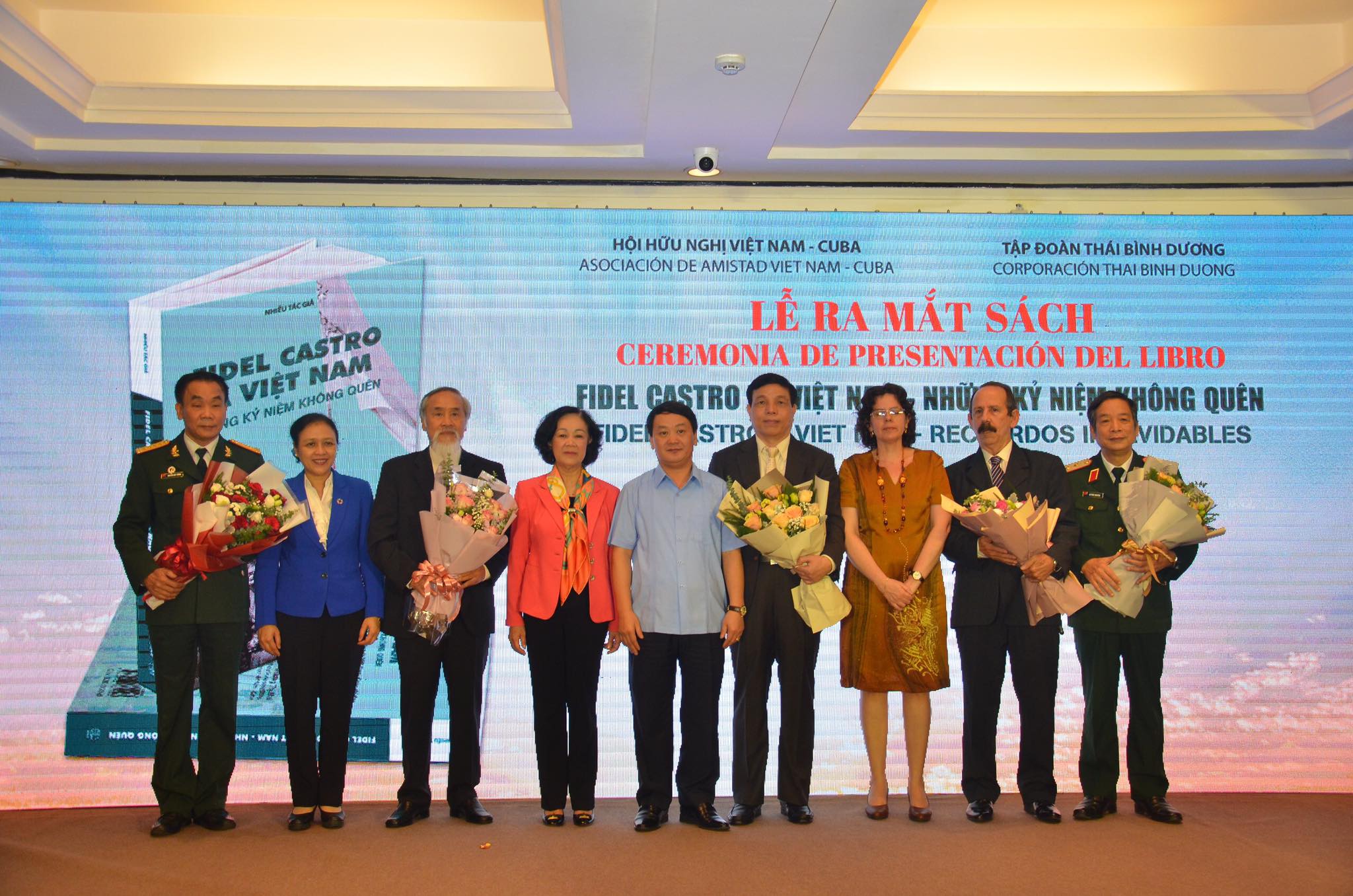 Ms. Truong Thi Mai - Member of the Politburo, Secretary of the Party Central Committee, Head of the Central Commission for Mass Mobilisation, Chairwoman of Vietnam-Cuba Friendship Association and Ms. Lianys Torres Rivera - Ambassador Extraordinary and Plenipotentiary of the Republic of Cuba in Vietnam presenting flowers to the Editorial Board at the Book Launching Ceremony "Fidel Castro and Vietnam - Unforgettable Memories"