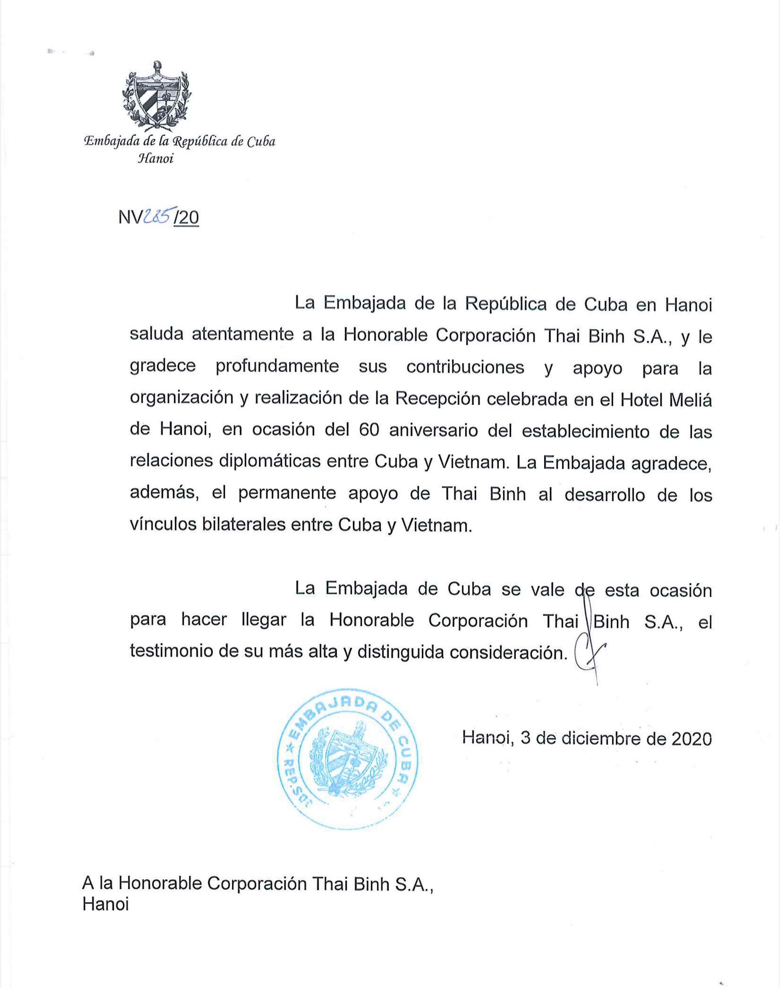 Embassy of Cuba in Vietnam sent a thank you letter to Pacific Corporation