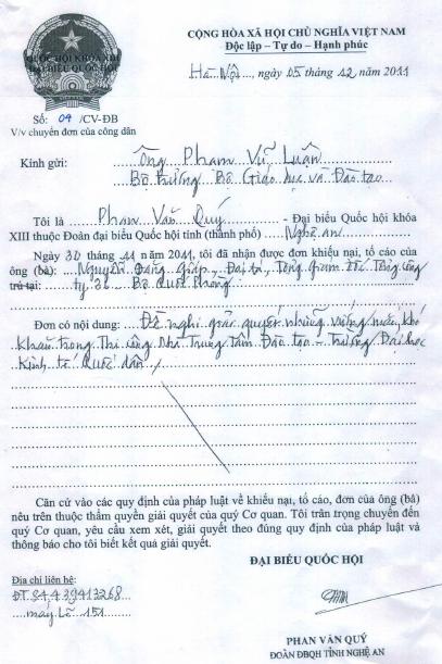 • ĐBQH Phan Văn Quý chuyển đơn của cử tri Lê Sỹ Lâm đến Sở LĐTBXH tỉnh Nghệ An (02/06/2016)