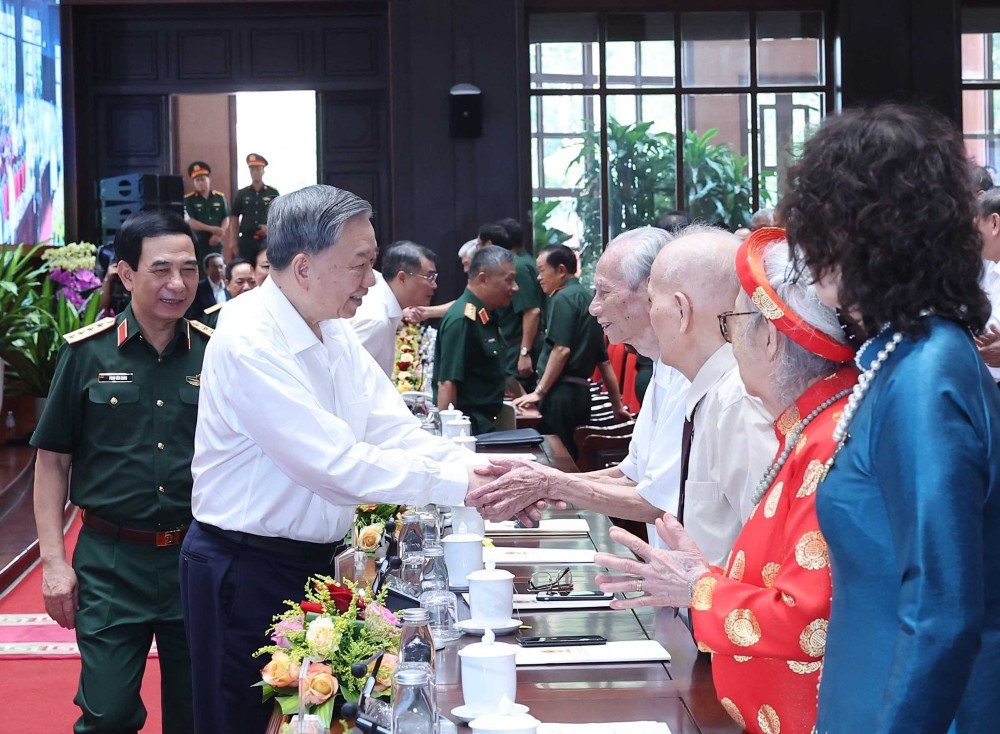 Tổng Bí thư Tô Lâm chào hỏi các đại biểu cán bộ lão thành cách mạng, tiền khởi nghĩa, Mẹ Việt Nam anh hùng