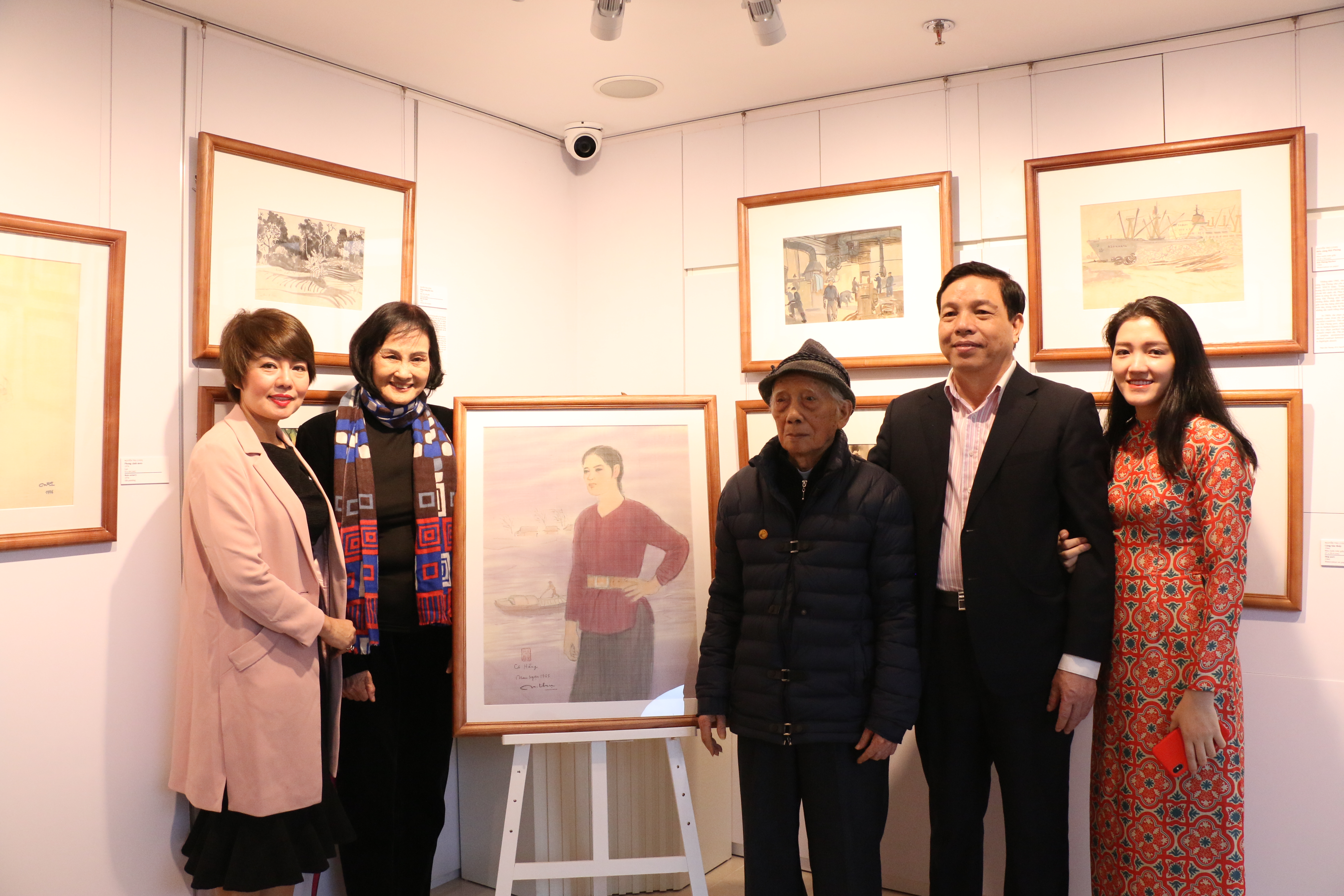 Trong ảnh: Anh hùng LLVTND, Chủ tịch HĐQT Công ty cổ phần Tập đoàn Thái Bình Dương Phan Văn Quý (thứ hai từ phải sang) cùng họa sĩ Nguyễn Thụ (thứ ba từ phải sang) bên bức tranh "Cô Hằng" - với nhân vật của bức tranh, nguyên Khu Đội trưởng dân quân Nam Ngạn, nguyên Bộ trưởng Bộ Lao động - Thương binh và Xã hội (thứ hai từ trái sang)