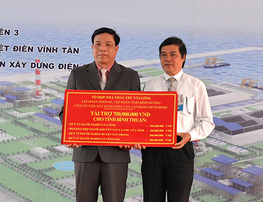 Tại Lễ khởi công Dự án Nhiệt điện Vĩnh Tân 4, Ông Phan Văn Quý, Đại biểu Quốc hội khóa 13, Chủ tịch HĐQT Công ty Cổ phần Tập đoàn Thái Bình Dương - thành viên tổ hợp nhà thầu EPC đã trao tặng 700 triệu đồng cho hoạt động xã hội, từ thiện của tỉnh Bình Thuận.