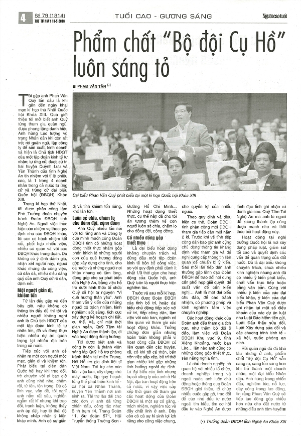 Rời quân ngũ dù đã khá lâu nhưng ở anh, phẩm chất “Bộ đội Cụ Hồ” vẫn sáng rõ, càng tỏa sáng hơn khi trở thành một doanh nhân, một đại biểu Nhân dân. Anh hùng trong chiến đấu, nghiêm túc, nỗ lực, dày công trong lao động, tin rằng Phan Văn Quý sẽ tiếp tục đóng góp nhiều hơn nữa cho đất nước từ những điều anh tâm huyết.