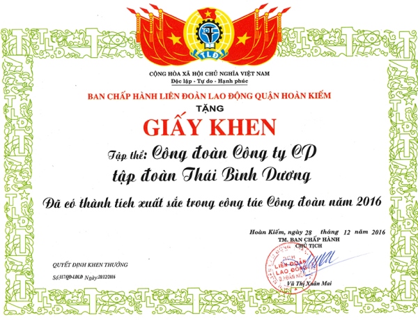 Sau phần tổng kết, đánh giá kết quả hoạt động công tác công đoàn năm 2016 và phát động phong trào thi đua năm 2017, Hội nghị đã công bố Quyết định khen thưởng và trao thưởng cho các đơn vị đạt thành tích xuất sắc trong công tác công đoàn. Công đoàn Công ty Cổ phần Tập đoàn Thái Bình Dương là một trong những đơn vị được Liên đoàn Lao động quận Hoàn Kiếm tặng Giấy khen vì đã có thành tích xuất sắc trong công tác công đoàn năm 2016.