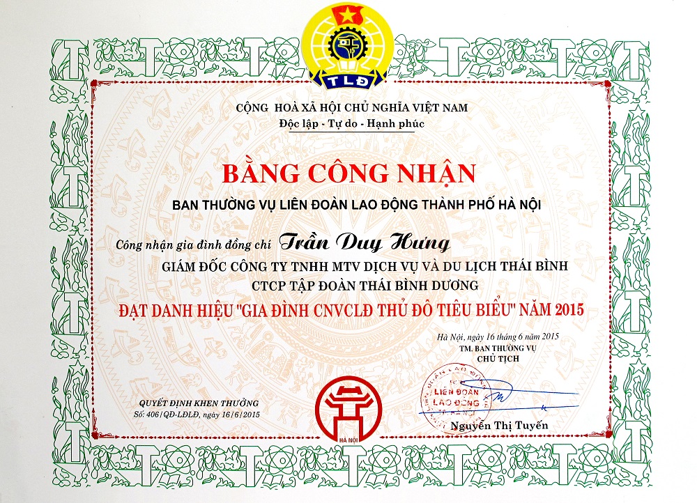 Tại Hội nghị lần này, đồng chí Trần Duy Hưng - Giám đốc Công ty TNHH MTV Du lịch Thái Bình - đơn vị thành viên của Công ty cổ phần Tập đoàn Thái Bình Dương đã vinh dự được Liên đoàn Lao động thành phố Hà Nội biểu dương và công nhận gia đình đồng chí Trần Duy Hưng đạt danh hiệu “Gia đình CNVCLĐ Thủ đô tiêu biểu” năm 2015.