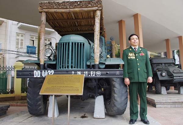 Anh hùng LLVTND Phan Văn Quý chụp ảnh bên chiếc xe đã cùng ông gắn bó trong những năm kháng chiến chống Mỹ.
