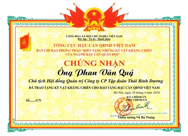 Giấy chứng nhận của Tổng cục hậu cần trao tặng ông Phan Văn Quý - Chủ tịch HĐQT Công ty cổ phần Tập đoàn Thái Bình Dương