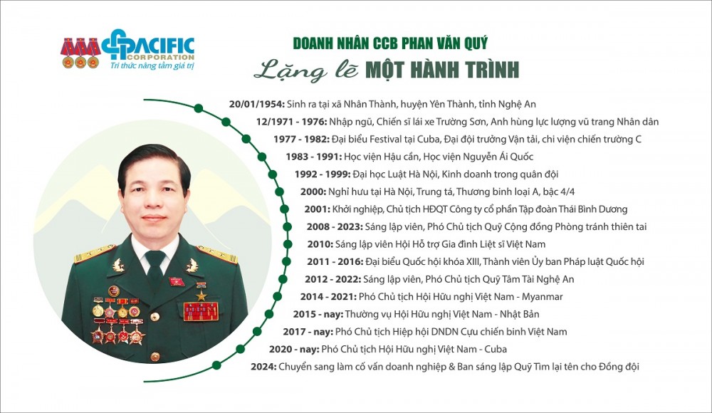 Tình cờ, qua một người quen, tôi đã được giới thiệu về cuốn sách “Lặng lẽ một hành trình”. Đây là cuốn sách mới nhất về cựu chiến binh, doanh nhân, Anh hùng Lực lượng vũ trang nhân dân Phan Văn Quý - Chủ tịch Tập đoàn Thái Bình Dương. Cuốn sách do Đại tá, Nhà báo Nguyễn Duy Tường - Tổng Biên tập Báo CCB Việt Nam chấp bút, được Nhà xuất bản Quân đội Nhân dân xuất bản, phát hành rộng rãi.