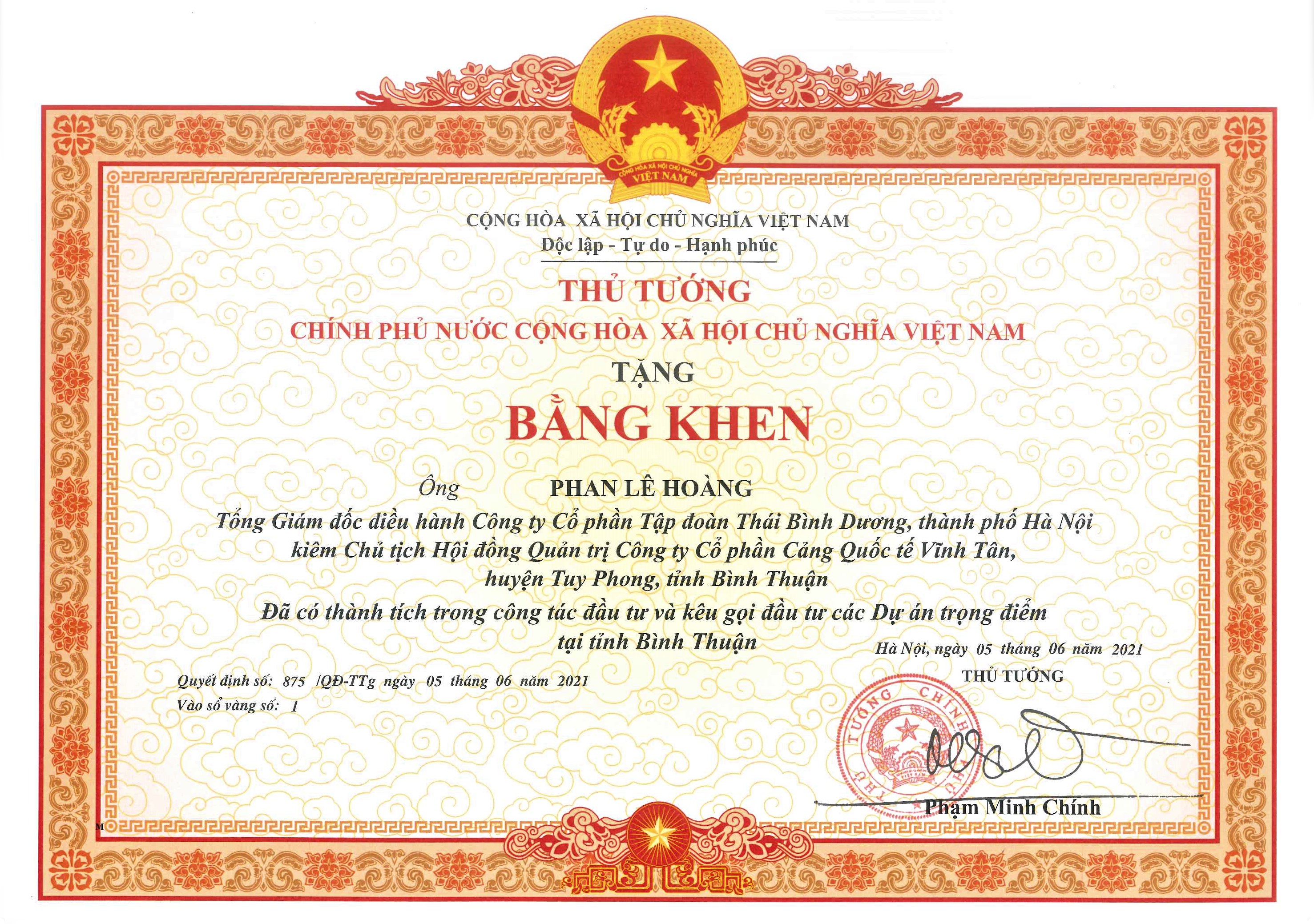 Với cương vị là Tổng giám đốc Điều hành Tập đoàn, ông Phan Lê Hoàng luôn phát huy tinh thần sáng tạo, gương mẫu của người đứng đầu, dám nghĩ, dám làm và luôn kiên định với mục tiêu đề ra, đưa Tập đoàn và các đơn vị thành viên vượt qua những thử thách, khó khăn, phát triển ổn định và bền vững. Vì những đóng góp nêu trên, theo Quyết định số 875/QĐ-TTg ngày 05/6/2021, CEO Phan Lê Hoàng vinh dự được Thủ tướng Chính phủ tặng Bằng khen.