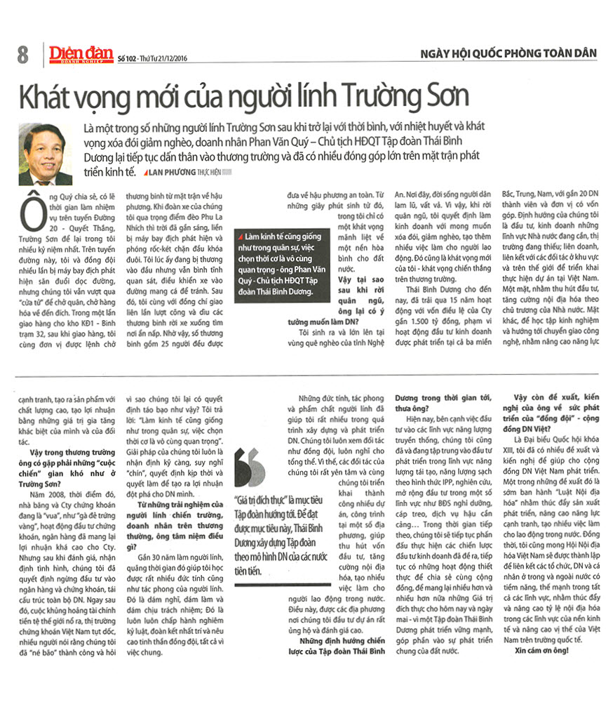 Báo Diễn đàn doanh nghiệp: "Khát vọng mới của người lính Trường Sơn"