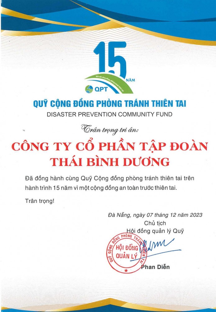 Ngày 7/12, tại TP. Đà Nẵng, Quỹ Cộng đồng phòng tránh thiên tai tổ chức lễ kỷ niệm 15 năm thành lập và đón nhận Bằng khen của Thủ tướng Chính phủ, Bằng khen của Bộ NN&PTNT cho những đóng góp vào việc nâng cao nhận thức phòng tránh thiên tai của người dân và các địa phương trong cả nước. Tham dự chương trình có nguyên Chủ tịch nước Trương Tấn Sang, nguyên Chủ tịch nước Nguyễn Xuân Phúc, Bộ trưởng Bộ NN&PTNT Lê Minh Hoan.