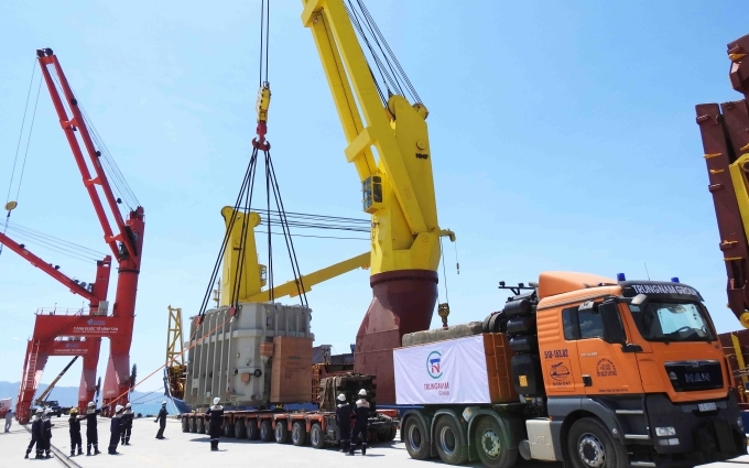 Các chuyên gia, kỹ sư và chuyên viên kỹ thuật của Trungnam Group bốc dỡ hai siêu biến áp tại Cảng quốc tế Vĩnh Tân để vận chuyển đến công trường.