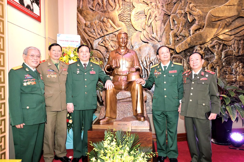 Anh hùng Phan Văn Quý (thứ ba, trái sang) và đại diện gia đình Trung tướng Đồng Sỹ Nguyên bên tác phẩm điêu khắc “Thực địa tại chiến trường” tại Bảo tàng Đường Hồ Chí Minh.