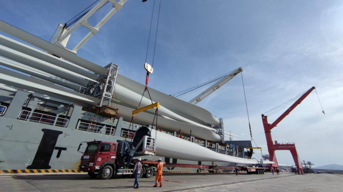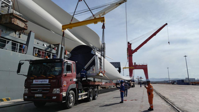 Thiết bị điện gió được bốc dỡ xuống xe chuyên dụng tại cảng.