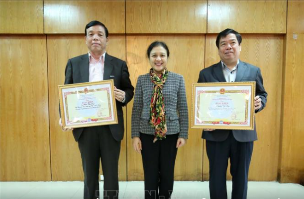 Chủ tịch Liên hiệp các tổ chức hữu nghị Việt Nam Nguyễn Phương Nga trao Bằng khen tặng Phó Chủ tịch Hội Hữu nghị Việt Nam - Cuba Phan Văn Quý và Phó Chủ tịch Hội Hữu nghị Việt Nam - Cuba Nguyễn Viết Thảo.