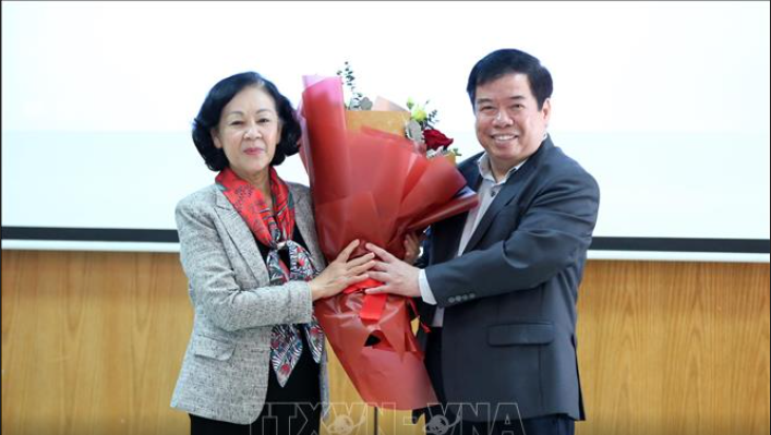 Phó Chủ tịch Hội Hữu nghị Việt Nam - Cuba Nguyễn Viết Thảo tặng hoa, chúc mừng đồng chí Trương Thị Mai nhân dịp Đại hội XIII thành công và các đồng chí được bầu vào Bộ Chính trị khóa XIII