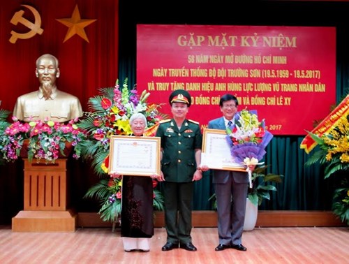 QĐND Online - Ngày 19-5, tại Hà Nội, Binh đoàn 12, Tổng công ty Xây dựng Trường Sơn đã tổ chức buổi gặp mặt kỷ niệm 58 năm Ngày truyền thống Bộ đội Trường Sơn (19-5-1959/19-5-2017) và truy tặng danh hiệu Anh hùng Lực lượng vũ trang nhân dân cho đồng chí Võ Bẩm và đồng chí Lê Xy.Đến dự buổi lễ có các đồng chí: Trung tướng Đồng Sỹ Nguyên, nguyên Ủy viên Bộ Chính trị, nguyên Phó chủ tịch Hội đồng Bộ trưởng, nguyên Tư lệnh Bộ đội Trường Sơn; Thiếu tướng Lê Hiền Vân, Phó chủ nhiệm Tổng cục Chính trị.