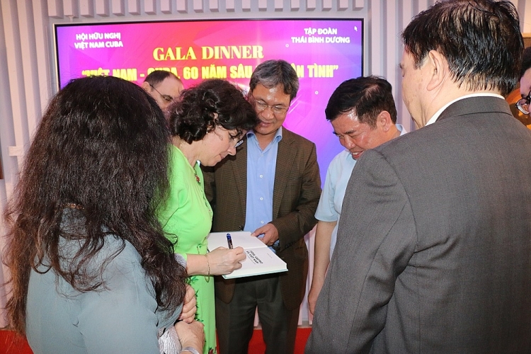 Đại sứ Lianys Torres Rivera ký sách "Việt Nam và Cuba - Những kỷ niệm không quên" tặng các đại biểu tham dự gala.