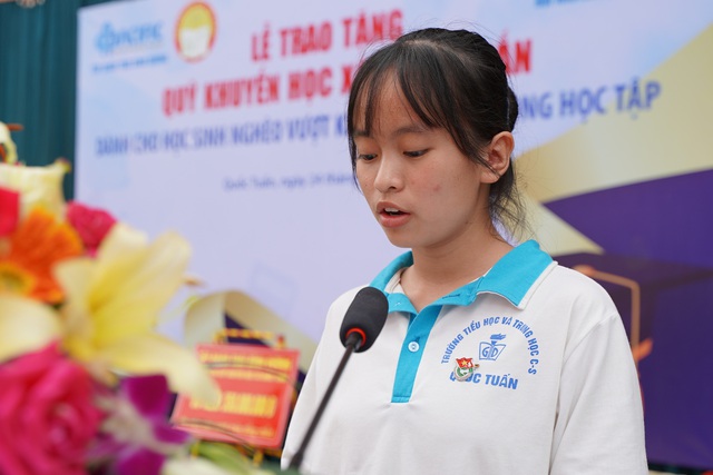 Em Triệu Phạm Phương Thanh, học sinh lớp 9A1 trường Trung học cơ sở Quốc Tuấn đại diện hơn 800 em học sinh trường Trung học và Tiểu học Quốc Tuấn gửi lời cảm ơn đến nhà tài trợ, Hội Khuyến học Việt Nam.