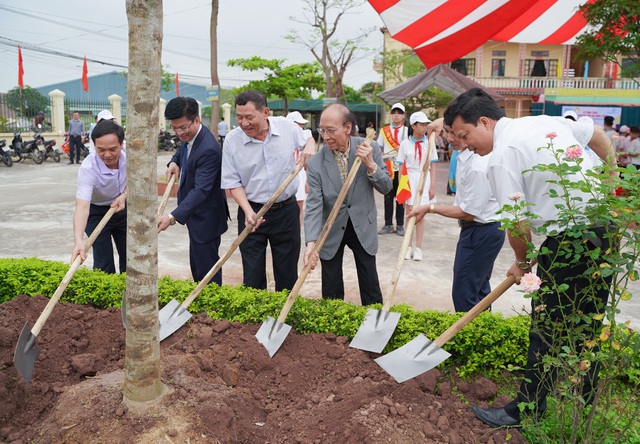 Các đại biểu trồng cây lưu niệm trong khuôn viên trường Trung học và Tiểu học Quốc Tuấn.
