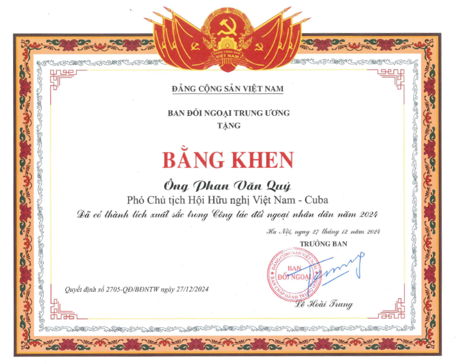 Tại Hội nghị, đồng chí Phan Văn Quý - Phó Chủ tịch Hội Hữu nghị Việt Nam - Cuba, Cố vấn cấp cao Tập đoàn Thái Bình Dương đã vinh dự nhận Bằng khen của Ban Đối ngoại Trung ương vì đã có thành tích xuất sắc trong công tác đối ngoại nhân dân năm 2024. Trong năm qua, cùng với các thành viên Ban lãnh đạo Hội Hữu nghị Việt Nam - Cuba, đồng chí Phan Văn Quý đã tham gia tổ chức các hoạt động của Hội theo đúng đường lối, chủ trương, chính sách của Đảng và Nhà nước; tham gia cùng Hội thực hiện một số hoạt động gắn kết với Cuba đạt được nhiều kết quả, cùng phát huy sức mạnh tổng hợp của tập thể để Hội Hữu nghị Việt Nam - Cuba ngày càng phát triển.