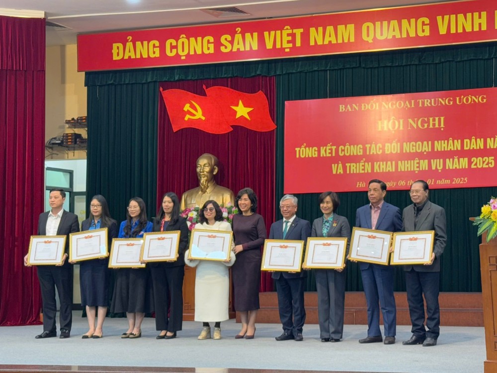 Thực hiện chương trình công tác năm 2024, ngày 6/1/2025, Ban Đối ngoại Trung ương đã tổ chức Hội nghị Tổng kết công tác đối ngoại nhân dân năm 2024, triển khai nhiệm vụ năm 2025. Nhân dịp này, Ban Đối ngoại Trung ương đã tổ chức trao bằng khen cho các cá nhân có thành tích xuất sắc trong công tác đối ngoại nhân dân năm 2024.