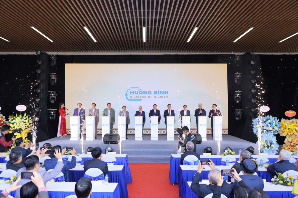 Các đồng chí lãnh đạo tỉnh Hòa Bình cùng ban cố vấn dự án bấm nút khai trương dự án tuyến cáp treo Hương Bình.