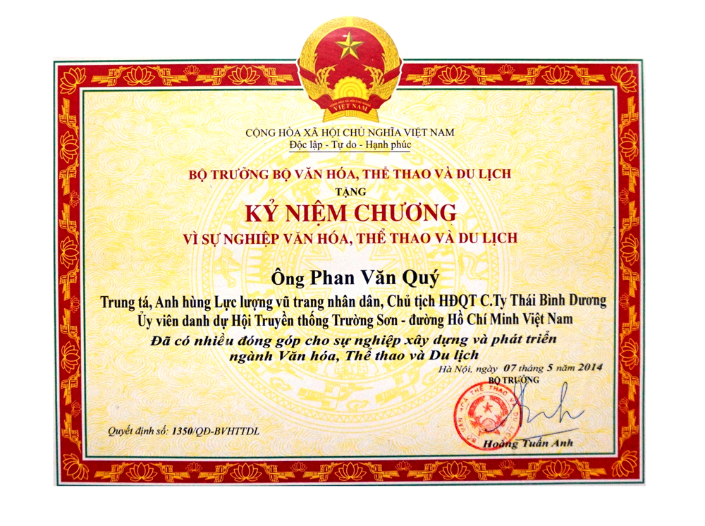 Bộ trưởng Bộ Văn hóa, Thể thao và Du lịch Hoàng Tuấn Anh ký tặng Kỷ niệm chương “Vì sự nghiệp văn hóa, thể thao và du lịch” cho Chủ tịch HĐQT Phan Văn Quý
