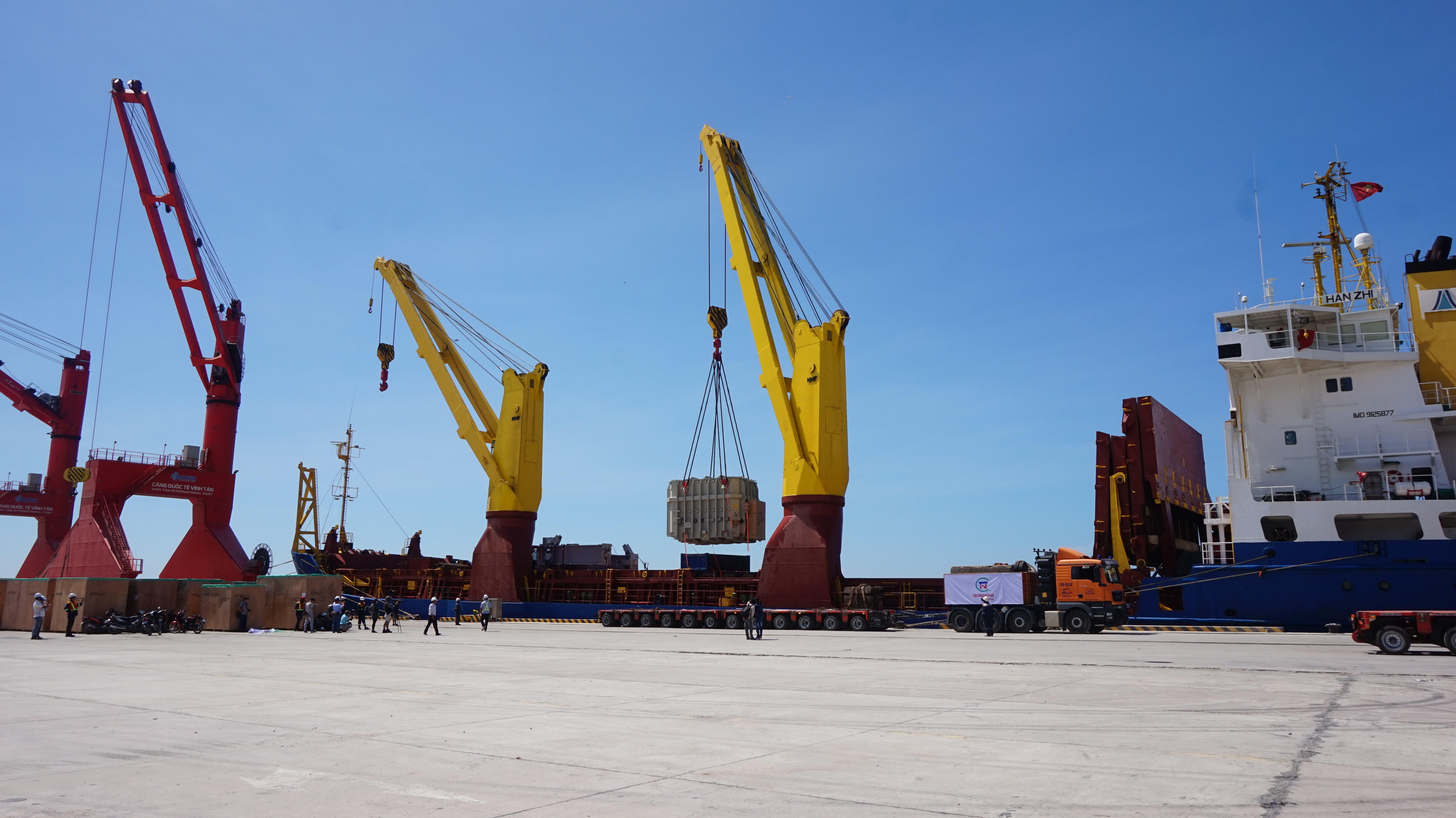 Tàu Han Zhi, quốc tịch Singapore có trọng tải 7.388 DWT vận chuyển hơn 1.100 tấn thiết bị - trong đó có 06 máy biến thế 500 KV cho dự án truyền tải điện Thuận Nam, tỉnh Ninh Thuận.