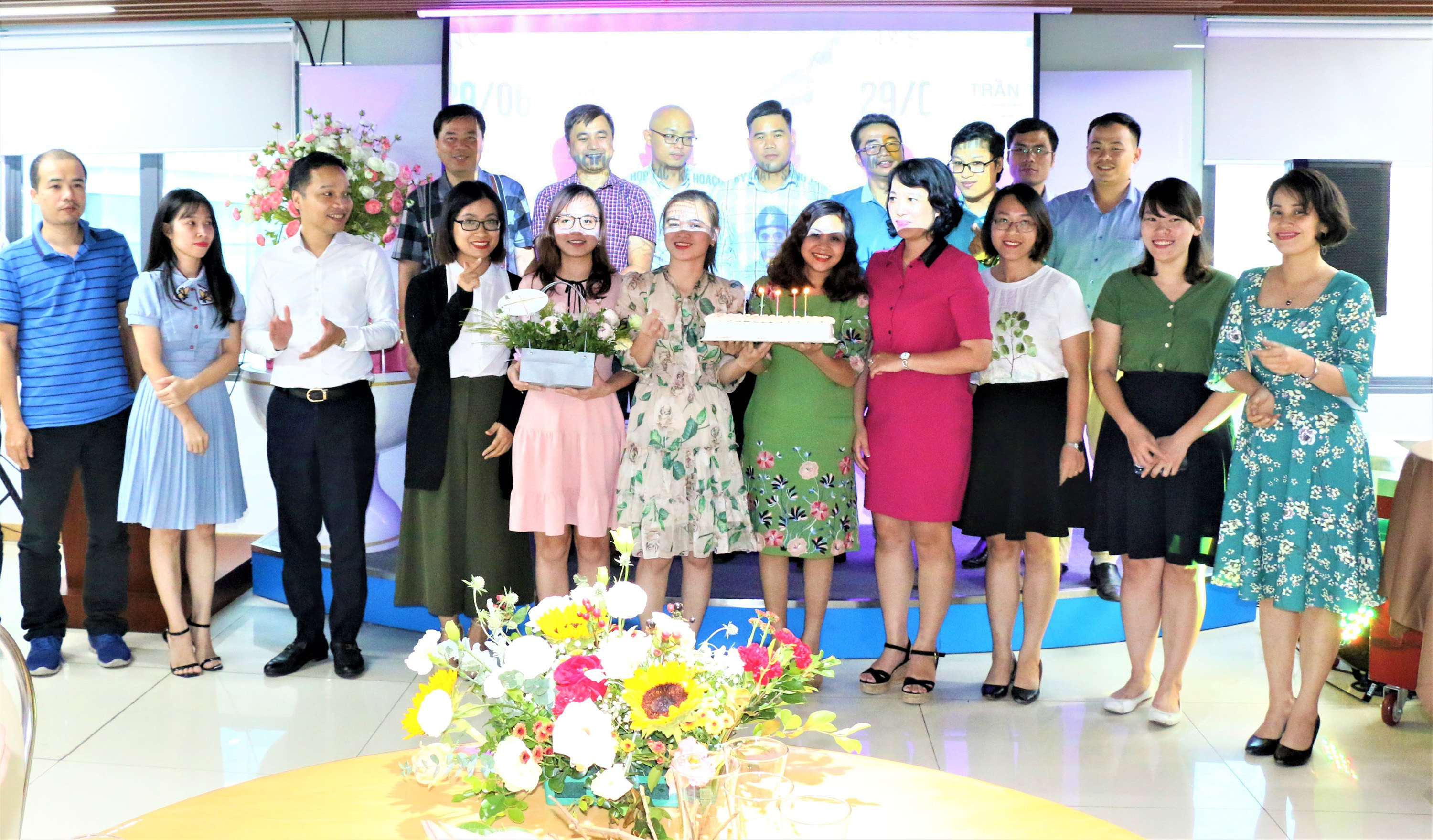 Tổng Giám đốc Trần Trung Dũng và chủ tịch công đoàn Tập đoàn Nguyễn Thị Toàn tặng hoa và bánh sinh nhật