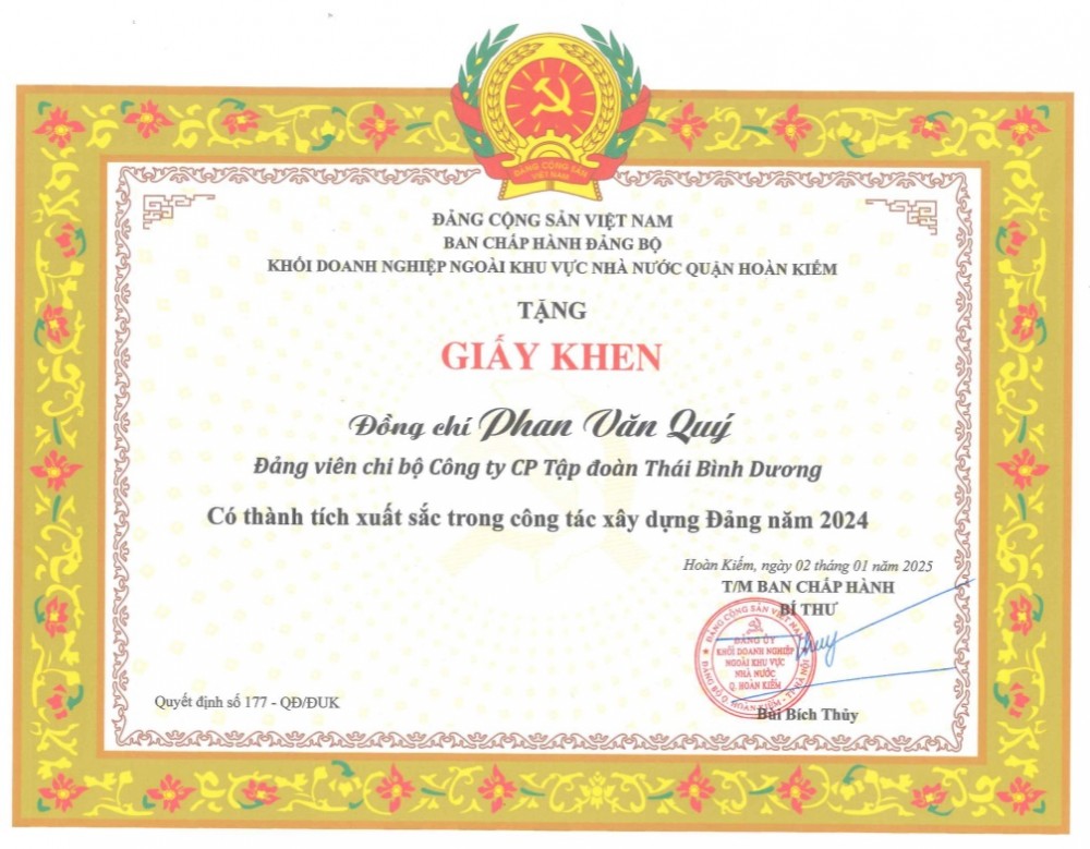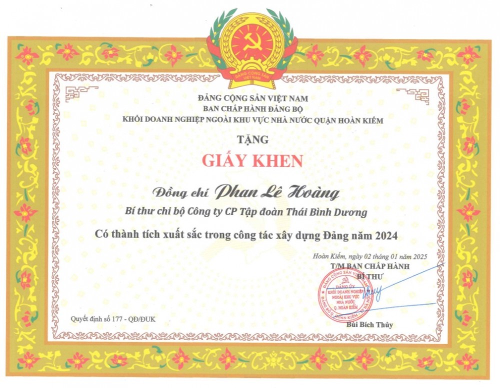 Bằng khen của Đồng chí Phan Lê Hoàng - Bí thư Chi bộ Tập đoàn Thái Bình Dương