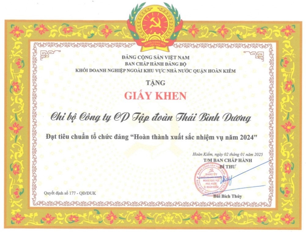 Sáng ngày 18/02/2025, tại Hội nghị triển khai công tác xây dựng Đảng và phát động phong trào thi đua yêu nước năm 2025, BCH Đảng ủy Khối Doanh nghiệp ngoài khu vực Nhà nước quận Hoàn Kiếm đã đã tổ chức khen thưởng các tập thể, cá nhân có thành tích xuất sắc trong công tác xây dựng Đảng năm 2024 trong đó có Chi bộ Công ty cổ phần Tập đoàn Thái Bình Dương.
