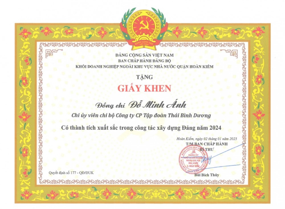 Bằng khen của Đồng chí Đỗ Minh Ánh – Chi ủy viên Chi bộ Tập đoàn Thái Bình Dương