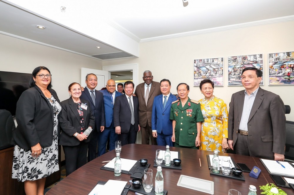 Chủ tịch Quốc hội Cuba (thứ sáu, từ trái qua) gặp gỡ những người bạn Việt Nam, trong đó có Ông Phan Văn Quý