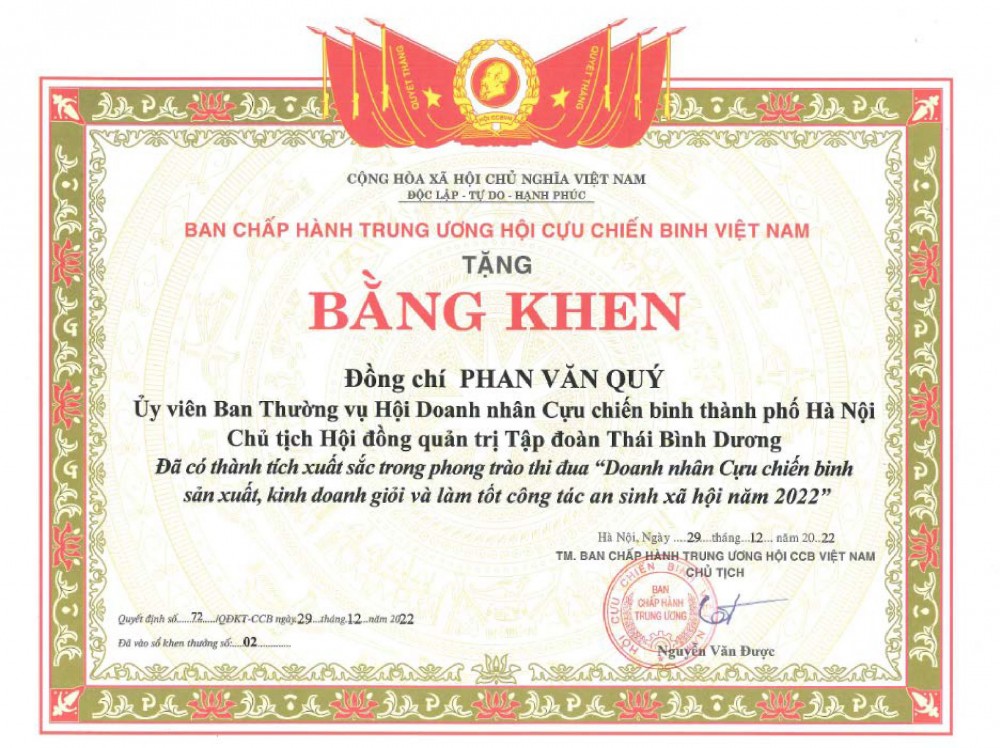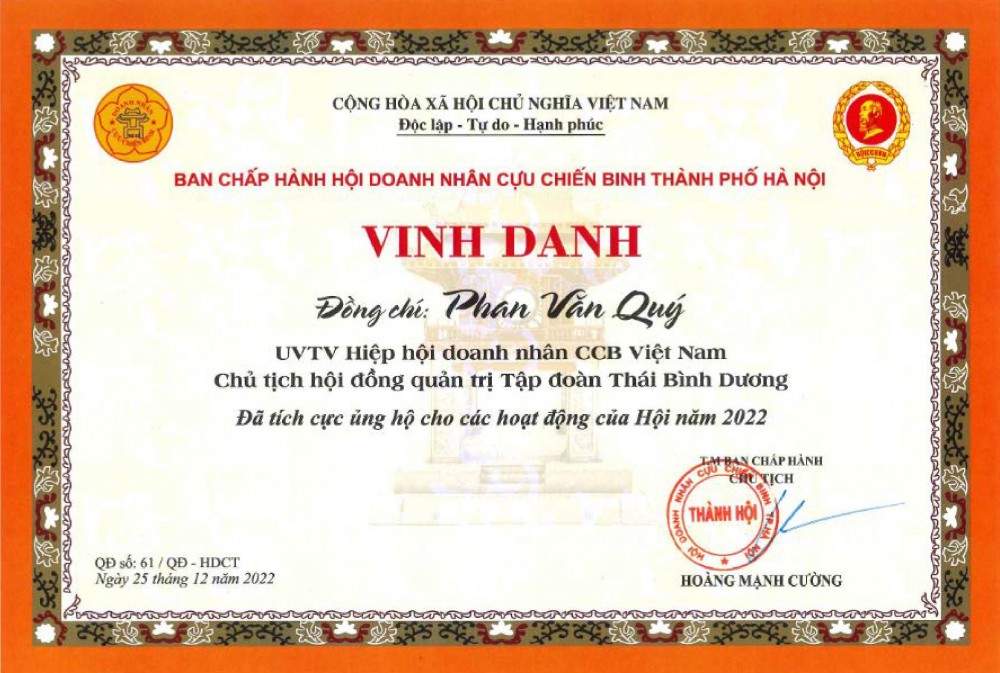 Ghi nhận những tình cảm và đóng góp thiết thực của Đồng chí Phan Văn Quý, Hội Cựu chiến binh Việt Nam đã quyết định tặng Bằng khen cho Chủ tịch HĐQT Tập đoàn Thái Bình Dương vì đã có thành tích xuất sắc trong phong trào thi đua "Doanh nhân Cựu chiến binh sản xuất, kinh doanh giỏi và làm tốt công tác an sinh xã hội năm 2022”.