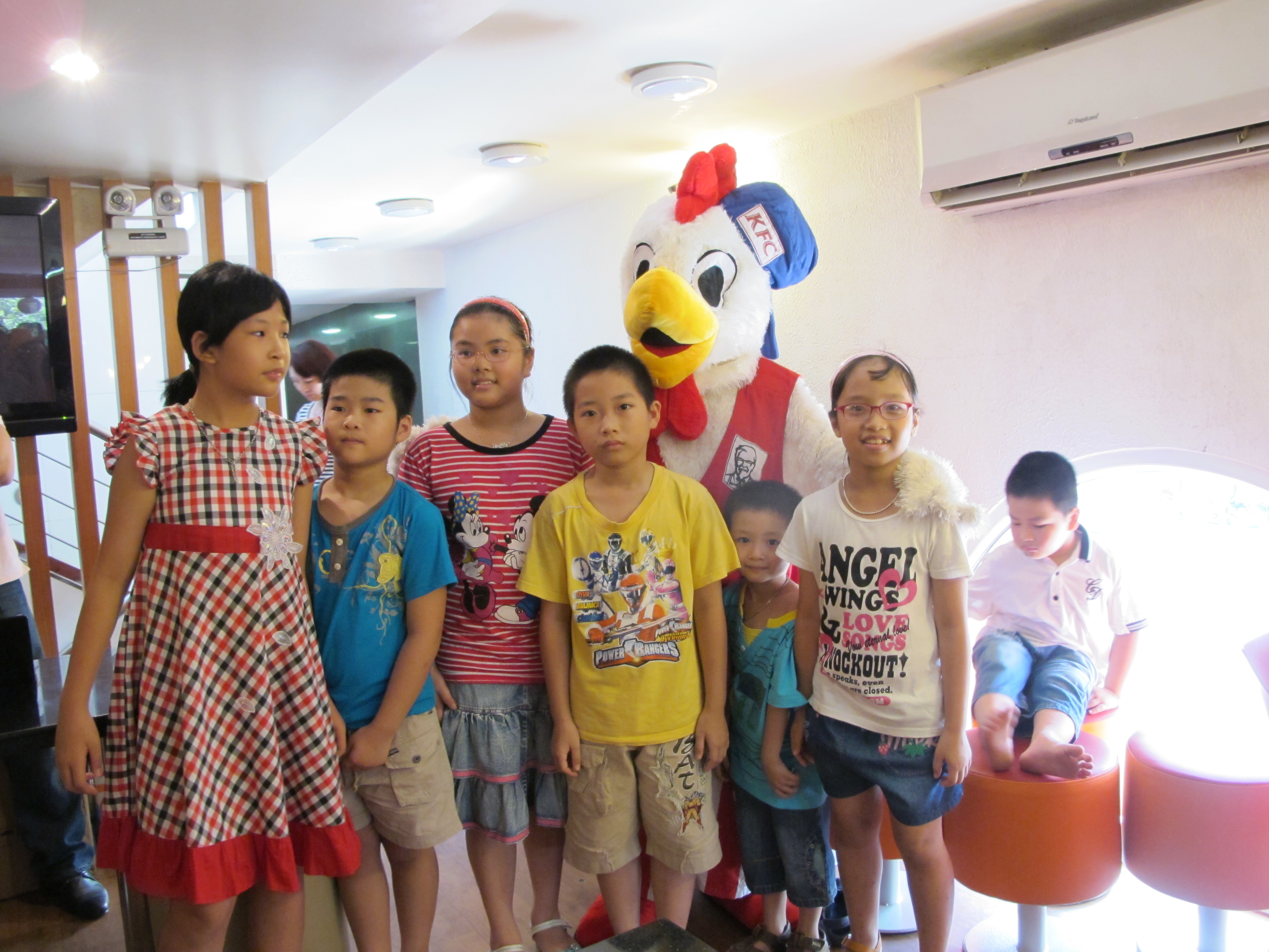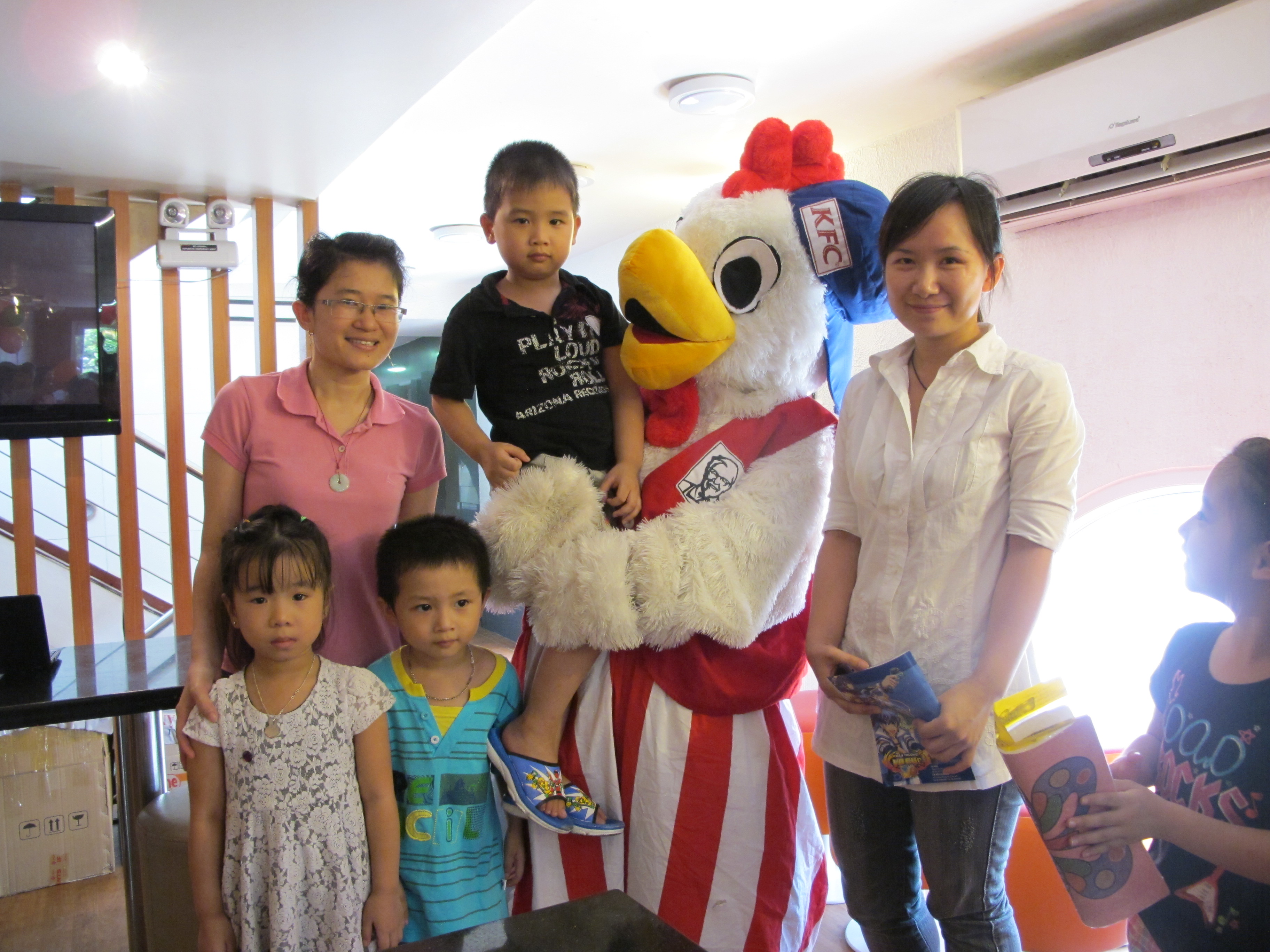 Các bé chụp ảnh với chú gà Mascot của nhà hàng KFC