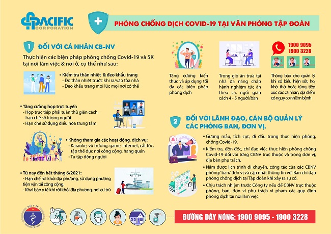 Trước tình hình dịch Covid 19 vẫn tiếp tục lây lan trên nhiều khu vực tại Hà Nội nói riêng và các địa phương trên cả nước nói chung, Ban phòng chống dịch Tập đoàn Thái Bình Dương đã và đang đề nghị CBNV nghiêm túc thực hiện các biện pháp phòng chống dịch tại nơi làm việc và nơi ở theo hướng dẫn của cơ quan chức năng: khai báo y tế đầy đủ, đo thân nhiệt, thực hiện giãn cách tại vị trí làm việc, đeo khẩu trang và giữ gìn vệ sinh trong môi trường công sở v.v