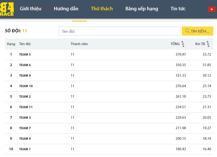 Bảng xếp hạng 11 đội và bảng xếp hạng thành tích cá nhân