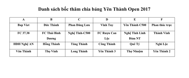 Tối ngày 15 tháng 11 năm 2017, tại Hà Nội đã diễn ra Lễ bốc thăm chia bảng Giải bóng đá Yên Thành mở rộng 2017 lần thứ Nhất. Đây là năm đầu tiên Giải bóng đá Yên Thành mở rộng được tổ chức với mục đích cổ vũ, đẩy mạnh hoạt động bóng đá phong trào, rèn luyện sức khỏe góp phần làm phong phú thêm đời sống văn hóa tinh thần và kết nối cồng đồng người Yên Thành (Nghệ An) xa quê tại khu vực phía Bắc cũng như hướng tới kỷ niệm 180 năm thành lập huyện.